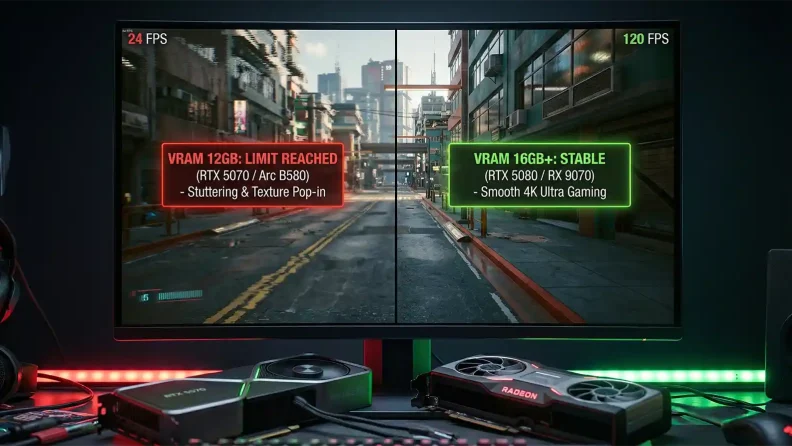グラフィックボード 【検証】VRAM 12GBは2026年の最新ゲームで“不足”するのか?数値で暴く性能スコアの嘘と真実 2026.2.5 「ベンチマークのスコアは良いはずなのに、最新のゲームを動かすとなぜかカクつく……」 10万円近く出して買った最新のRTX 5070やArc …
