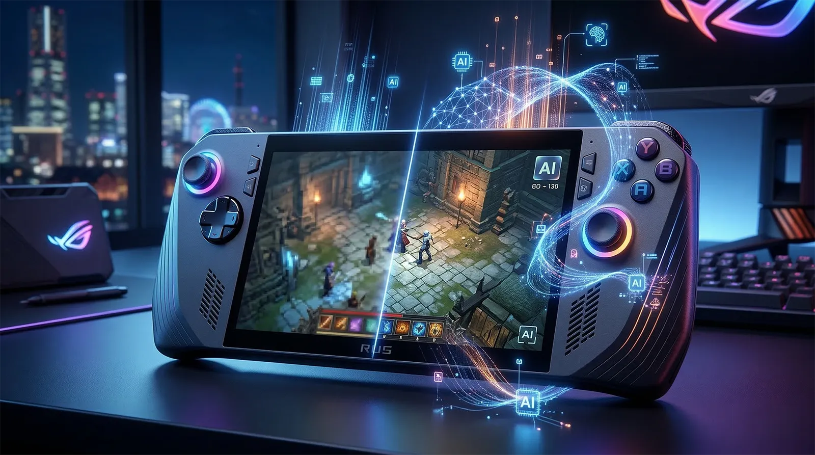 Nintendo Switchのような形状でPCゲームを携帯して遊べるデバイスです。中身はWindowsが動く普通のPCで、SteamやEpic Gamesなどのゲームライブラリがそのまま動作します。グラフィック設定の変更、外部モニター接続、マウス&キーボード接続にも対応。一方、専用GPUは非搭載で性能はデスクトップPCより低く、アップスケーリング技術(DLSS・FSR・Auto SR等)との組み合わせが前提の設計です。