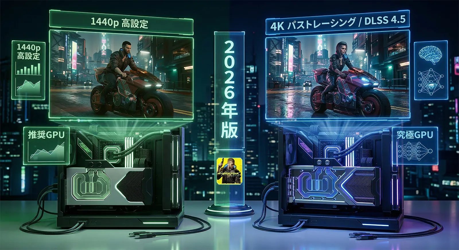 2020年発売ながら、パッチ2.1・2.21・2.3と更新が続き、2026年現在も重量級タイトルの代表格であり続けているゲームです。公式推奨の「RTX 2060 Super」はすでに現実からかけ離れており、快適プレイには解像度ごとに必要なGPUが大きく違います。パストレーシング(Overdrive Mode)はRTX 4090でもネイティブ20fps、そしてRTX 5080はパストレでRTX 4090より遅いという逆転現象まで起きています。DLSS 4.5対応・FSR 4対応の最新データを含めて解説します。