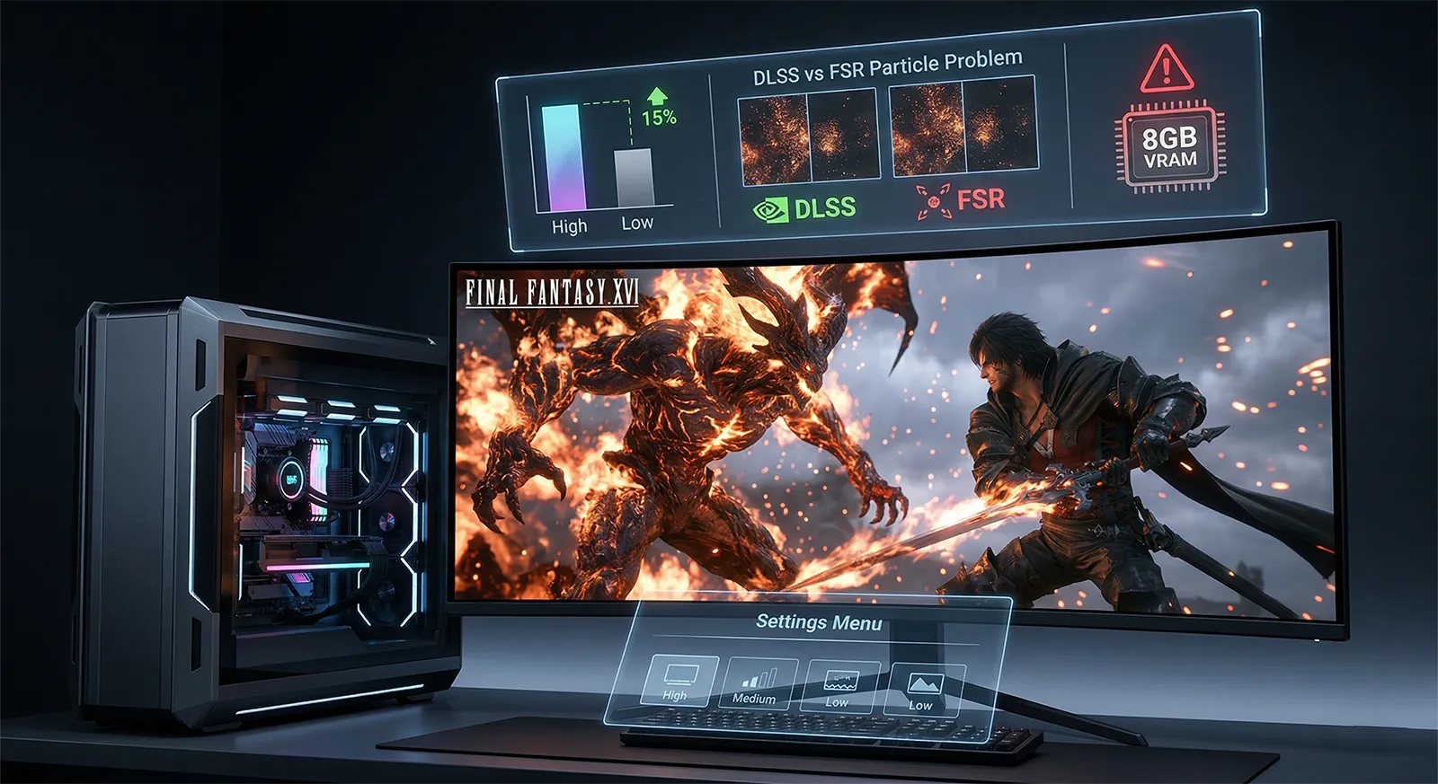 ファイナルファンタジー16 PC版おすすめ設定ガイド【2026年版】|設定を下げても15%しか速くならない理由・DLSS vs FSRパーティクル問題・VRAM 8GB問題を完全解説