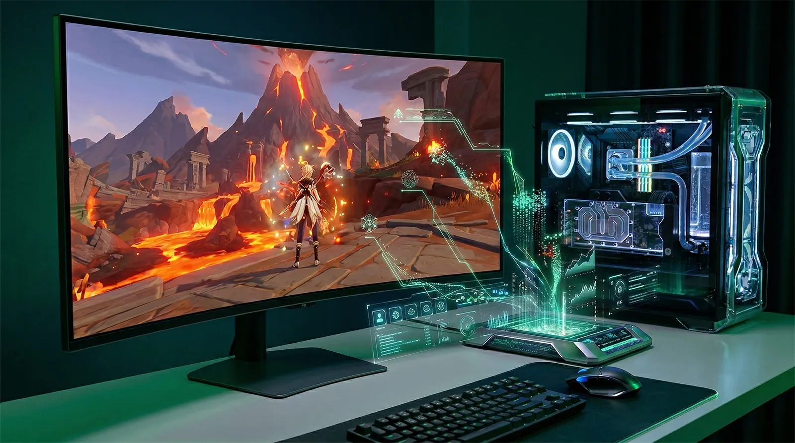 原神はスマートフォンとのクロスプレイを前提に設計された軽量ゲームですが、2つの点で注意が必要です。ひとつはアップスケーリング(DLSS/FSR/XeSS)に完全非対応なこと——解像度を調整できる手段はゲーム内の「レンダリング解像度」スライダーだけです。もうひとつは60fps→120fps化でGPU負荷が大幅に増加すること——GPUが追いつかない状態で120fps上限にすると、安定した60fpsより体感が悪くなることがあります。