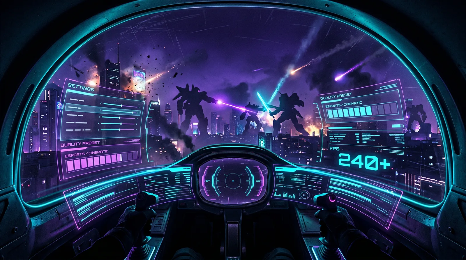 Mecha Breakは6段階のプリセット(Low / Medium / High / Ultra / Esports / Cinematic)を持ちます。EsportsとCinematicは性格が真逆で、用途で完全に使い分けます。