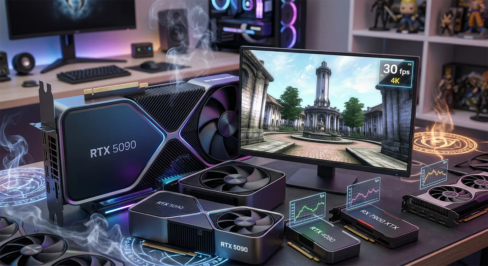 以下はDSO Gaming・HotHardware・PC Gamerが実施したベンチマークから収集したデータです。テスト環境はRyzen 9 7950X3D / 32GB DDR5 / Software Lumen(Hardware RT無効)。アップスケーリングはDLSS 4 Quality(AMD GPUはFSR 3 Quality)を使用しています。