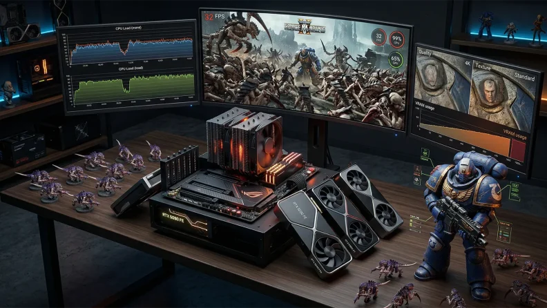 PCゲーム情報 2026.4.11 (更新: 2026.4.17) Warhammer 40,000: Space Marine 2 GPU別ベンチマーク【2026年版】|大群シーンでGPUが無力になる理由・フレーム生成の実効果・4Kテクスチャパックの実態まで解説 Warhammer 40,000: Space Marine 2のGPU別fps実測データ【2026年最新・Patch 5以降対応】。大群シーンではGPUよりCPUがボトルネックになるSwarm Engineの特性、パッチ5.0追加のDLSS 3/FSR 3フレーム生成の実効果、4Kテクスチャパック(85GB・推奨VRAM 16GB)の実態まで解説します。